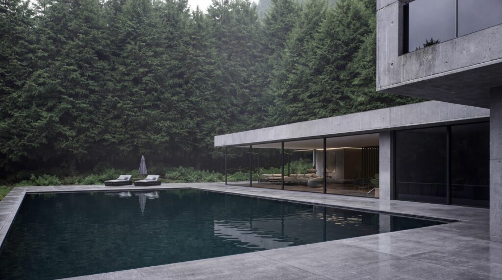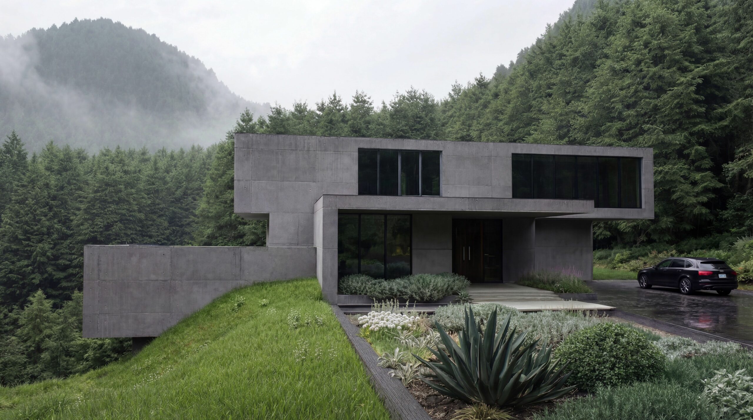 Ta nowoczesna willa z betonu, wkomponowana w zalesione zbocze, pokazuje, że